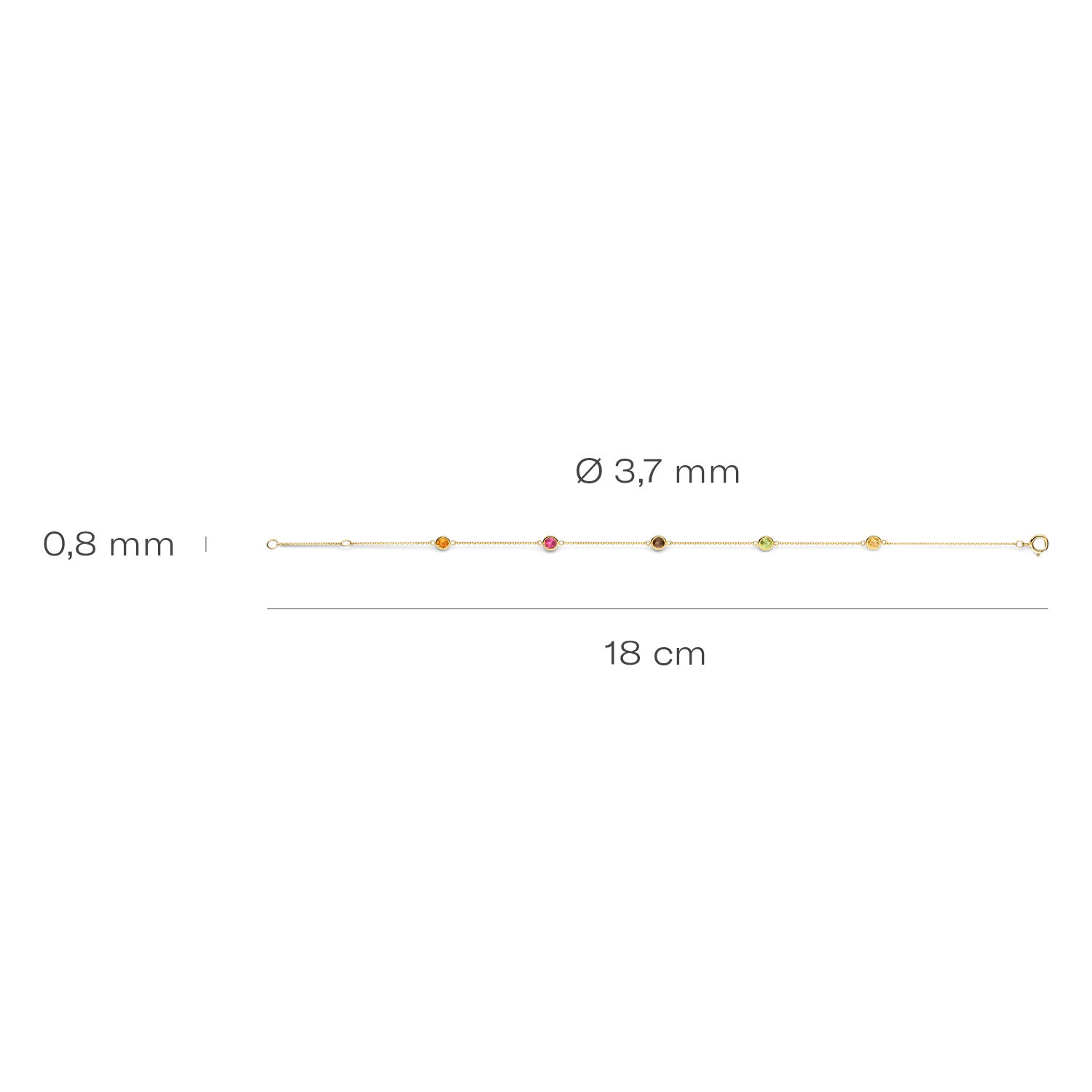 Deze elegante armband bestaat uit fijne schakeltjes afgewisseld met gekleurde stenen. De armband is gemaakt van 14k geelgoud en heel goed te combineren met andere sieraden uit onze collectie.